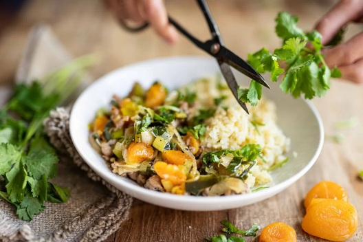 5. Servez le mijoté de porc aux abricots secs parsemé de coriandre.