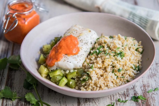13. Servez le merlu arrosé du coulis de poivron rouge et accompagné du boulgour à la coriandre.