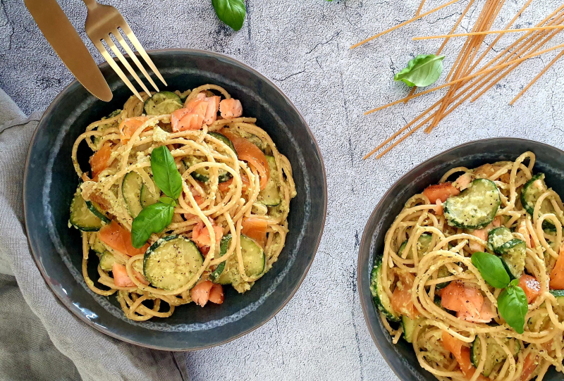 8. Mélangez les pâtes avec la sauce et les courgettes. Chauffez l'ensemble, ajoutez les 2 saumons et servez avec quelques feuilles de basilic frais.