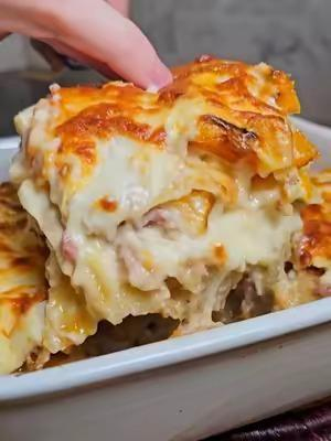 7. Met un peu de béchamel dans le fond de plat, une couche de pâtes, un peu de butter et, les lardons puis des pates, de 'a béchamel et ainsi de suite.Termine par une couche de béchamel et un peu de fromage râpé sur le dessus.