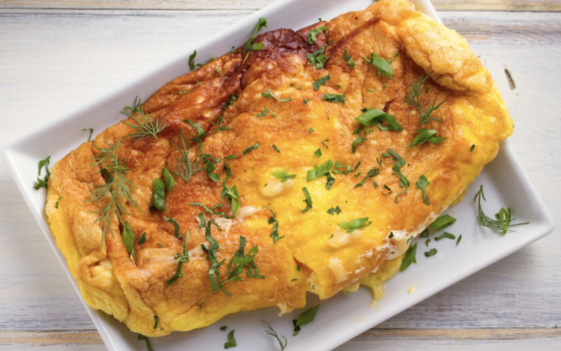 - 7.   Plier l’omelette en deux, laisser reposer une minute hors du feu.