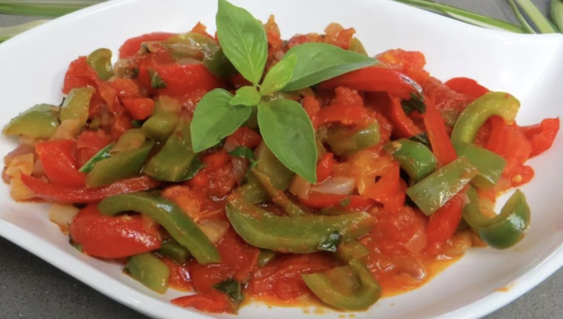 4. Dans la poêle, ajouter les poivrons, les tomates, cuire à feu modéré pendant 15 à 20 min environ puis ajouter le sel, le poivre, le cumin.