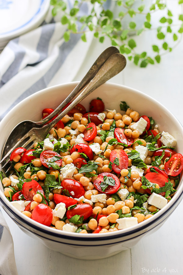 9. Ajoutez les pois chiches égouttés, les tomates coupées, les dés de féta et le persil ciselé.