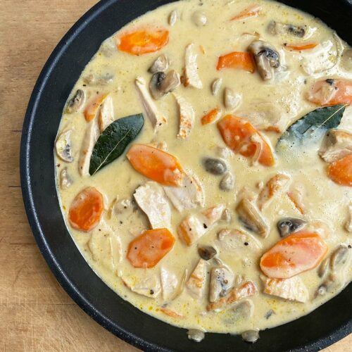 11. Une fois les carottes cuites (vérifier en enfonçant un couteau dedans), ajouter les escalopes de dinde coupées. Remuer pendant 30 secondes.