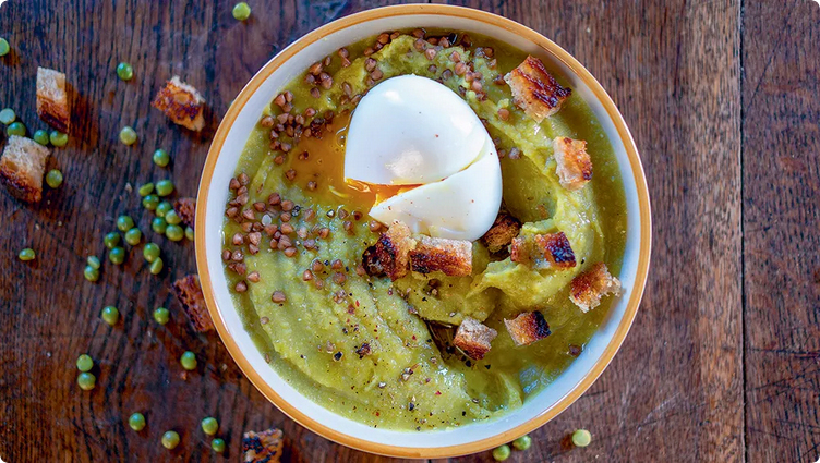 5. Quand les pois cassés sont presque fondants en bouche, les égoutter au-dessus d’une casserole de façon à garder le liquide. Les réduire en purée au mixeur plongeant, peu à peu, jusqu’à avoir une texture onctueuse, ni trop liquide ni trop épaisse ; au besoin, ajuster avec un peu de l’eau de cuisson réservée.